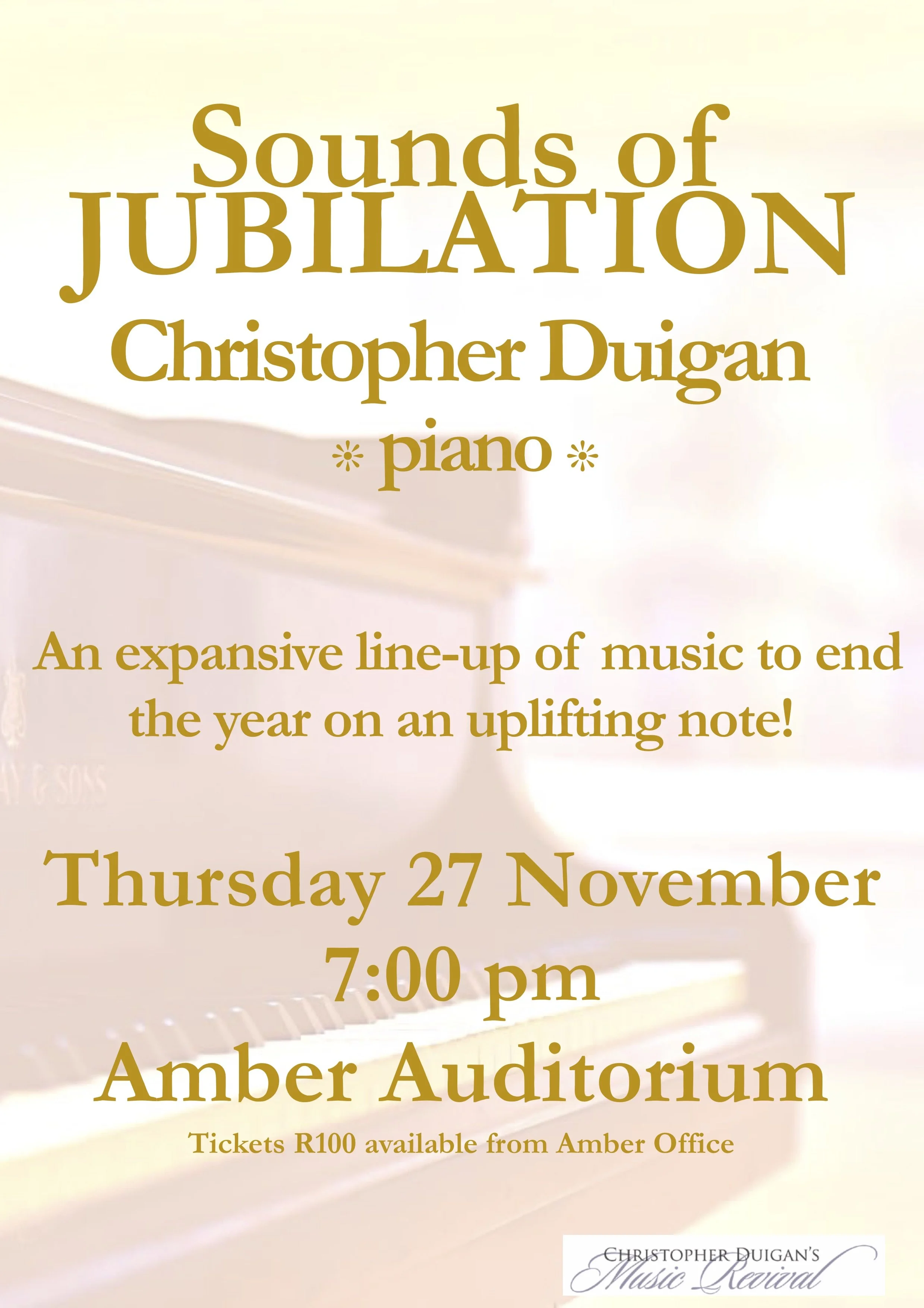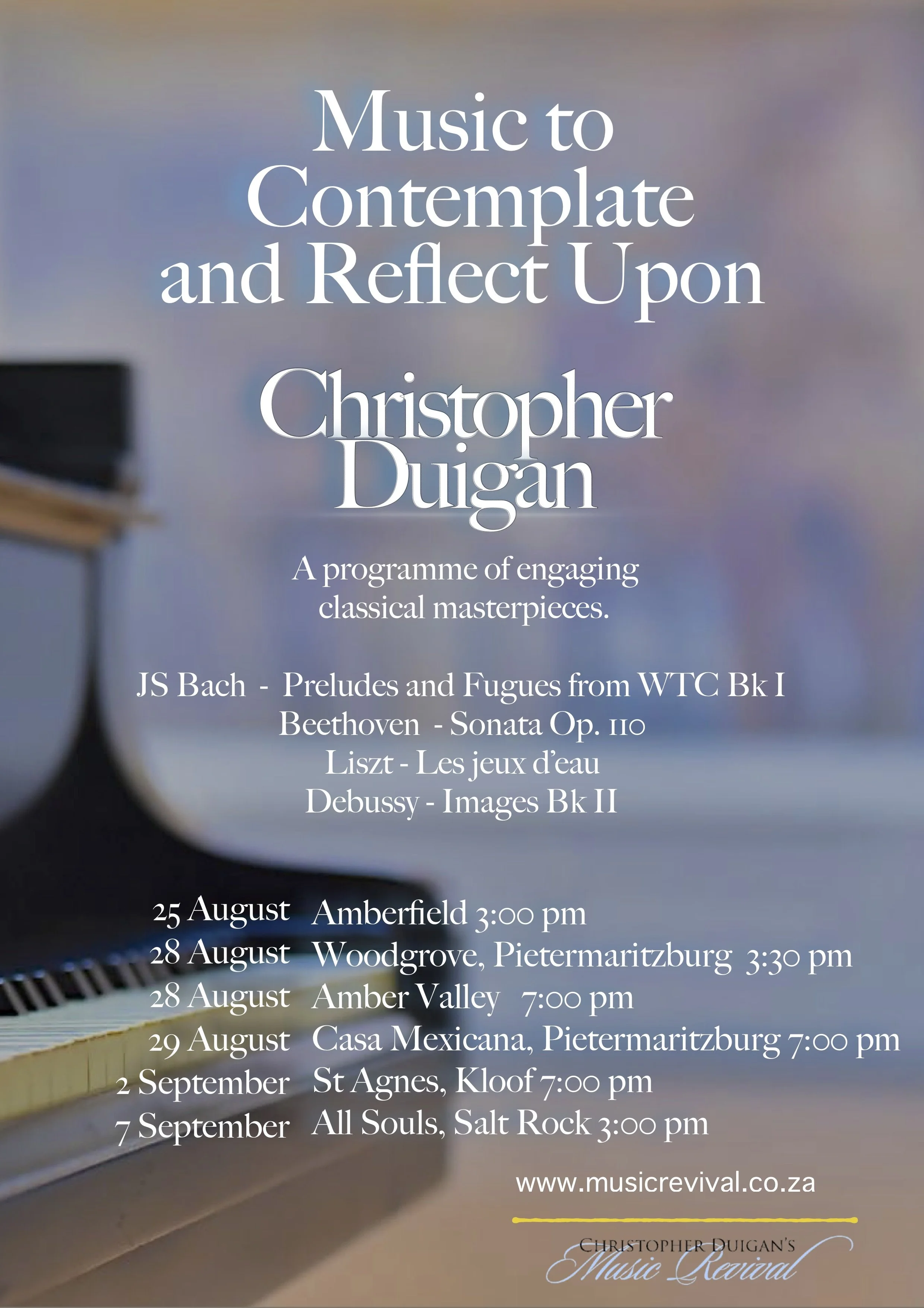 ‘Tales from My Piano’ is another fascinating and varied programme from the ongoing monthly concerts presented across KZN by pianist Christopher Duigan. This captivating series continues to showcase his exceptional talent and deep musical expression, offering audiences a rich and engaging experience each month.
