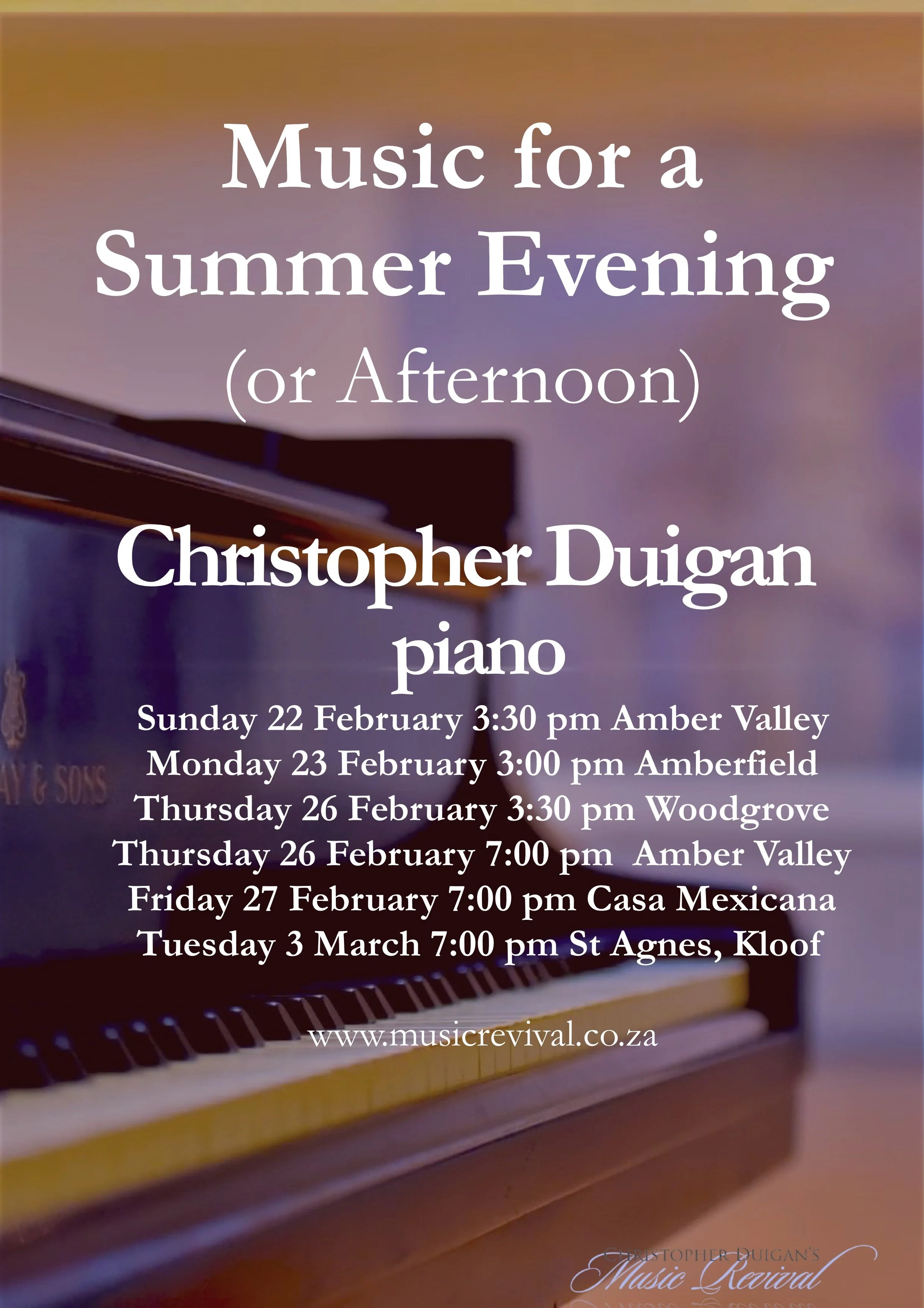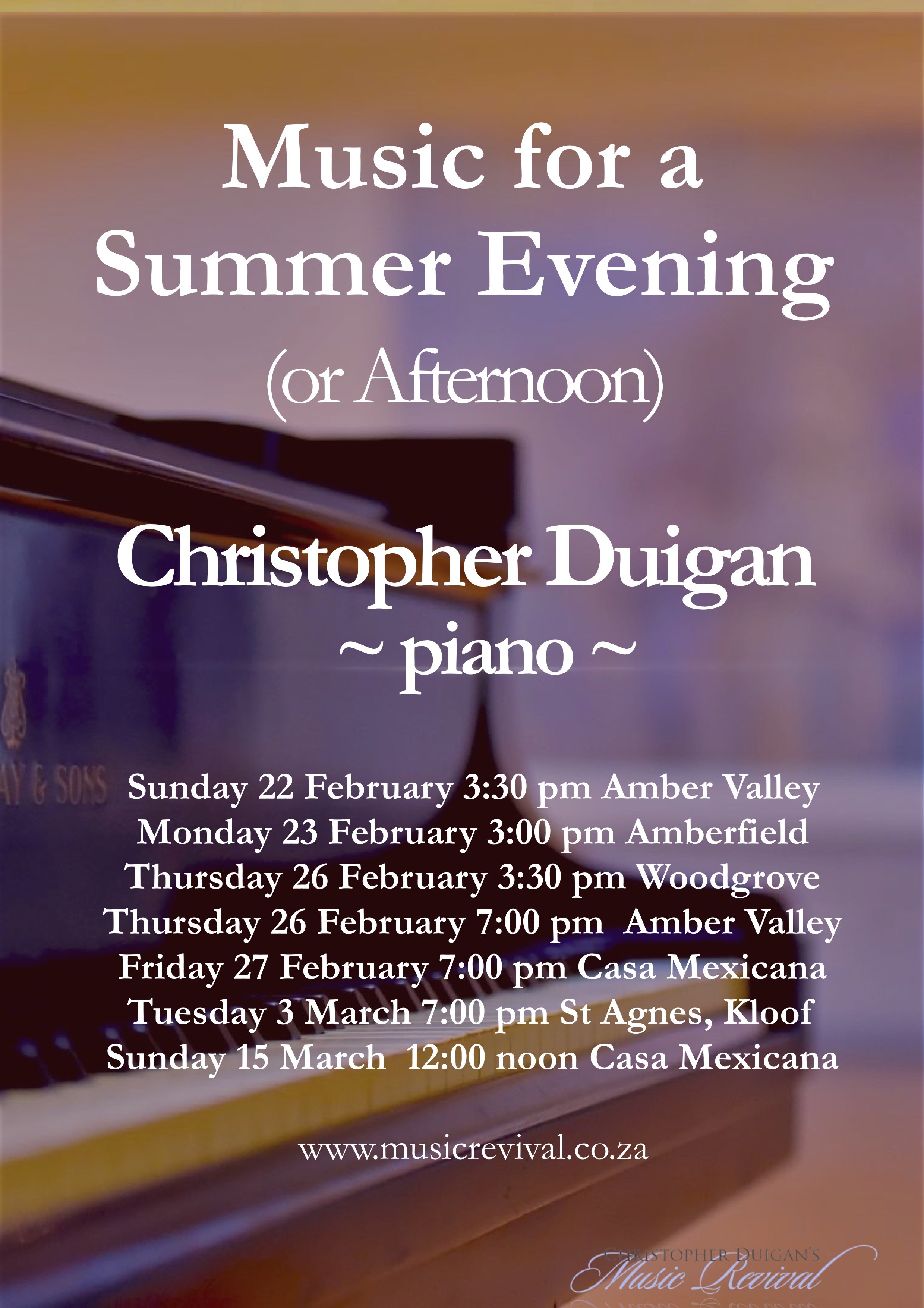 Music Revival Concert in KwaZulu-Natal with Steinway pianist Christopher Duigan presented on Pietermaritzburg, Amber Valley, Howick, Kloof and beyond. Based at Casa Mexicana.